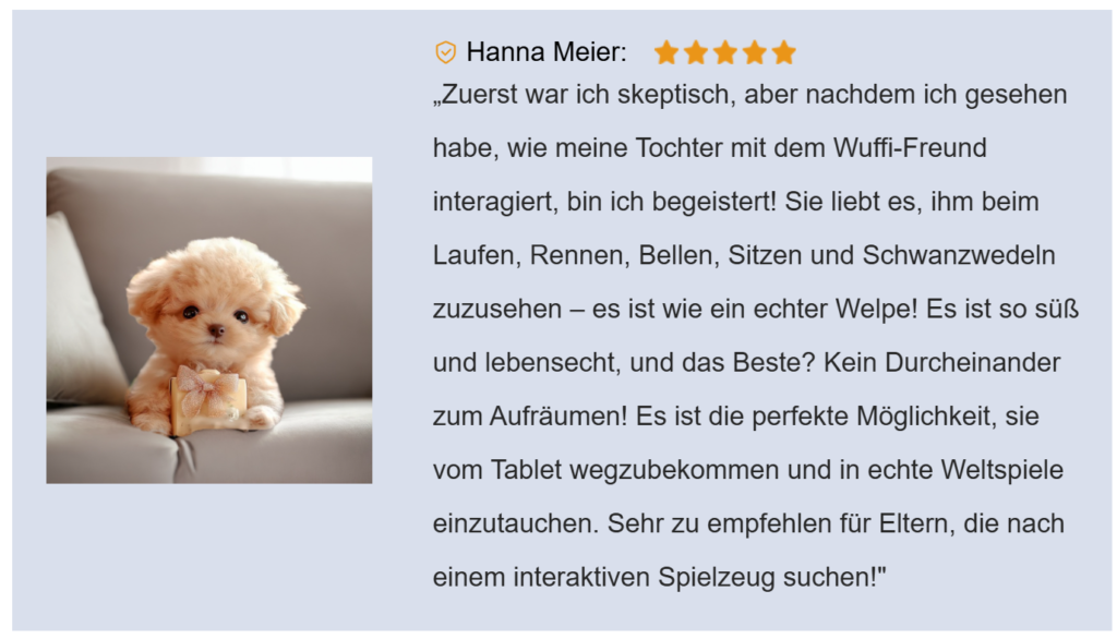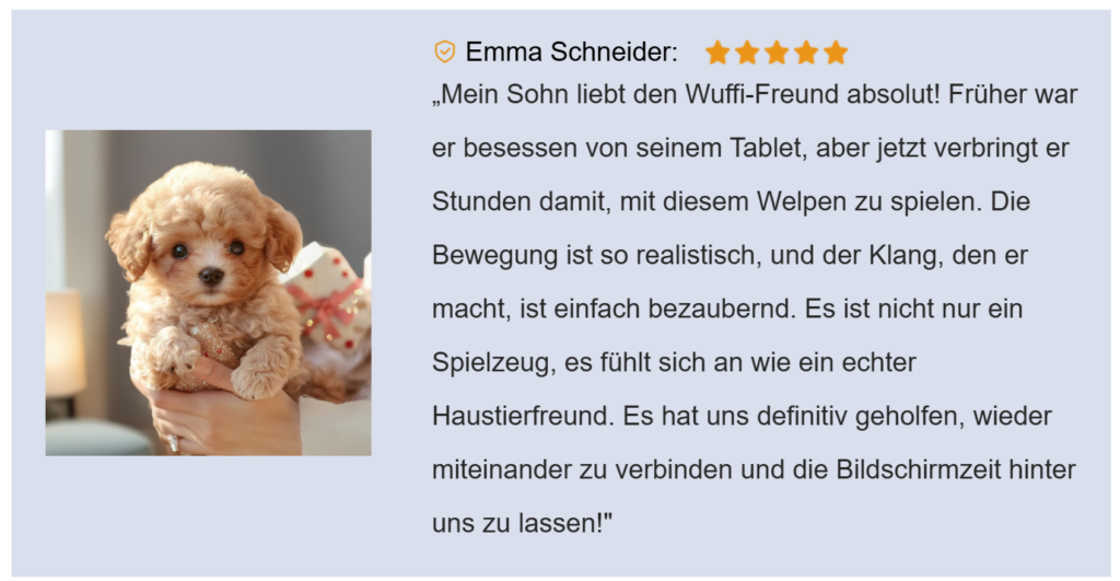 In diesem ausführlichen Testbericht zum Roboterwelpen Froplay Wuffi Freund erfahren Sie alles Wissenswerte: Was ist Froplay Hund? Wie funktioniert er? Welche herausragenden Merkmale bietet er? Welche Vorteile bietet er – sowohl emotional als auch praktisch? Wie sieht es mit der Sicherheit aus? Welche Erfahrungen haben Nutzer gemacht? Wie hoch ist der Preis? Und wo kann man ihn am besten kaufen? Ob Sie als Elternteil ein liebevolles Geschenk suchen, als Single einen fröhlichen Begleiter wünschen oder einfach nur ein Technikfan sind, der smarte Gadgets liebt: Froplay könnte Ihr neuer Lieblingsfreund werden.